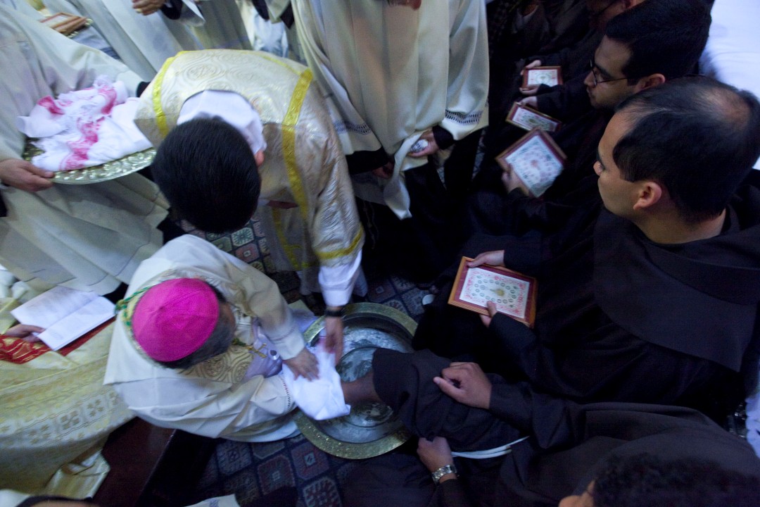 Basilica Resurrection, Blessed Sacrament, fouad twal, Holy Land,Holy Thursday is probably the most eventful day of the Easter Triduum, with the most diverse feelings experienced by the faithful. It started at the Holy Sepulchre Church. Patriarch Mgr. Fouad Twal was there with priests, who participated in the Blessing of the Holy Oils and, along with Mgr. Twal, renewed their priestly vows. During the celebration, which lasted about four hours, the liturgy was at the height of its splendor. The celebration ended with a solemn procession, at the end of which the Blessed Sacrament was exposed upon the altar at the very stone of the Holy Sepulcher.a Santa, Terre Sainte, Triduum