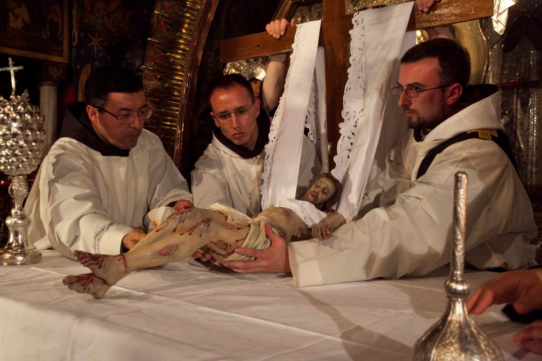On Good Friday afternoon, the Franciscans of the Custody of the Holy Land conduct a celebration in the Basilica of the Resurrection, known as the Funeral Procession of Christ. This celebration is not as well known as the other Easter celebrations, but it is a very moving and touching ceremony.