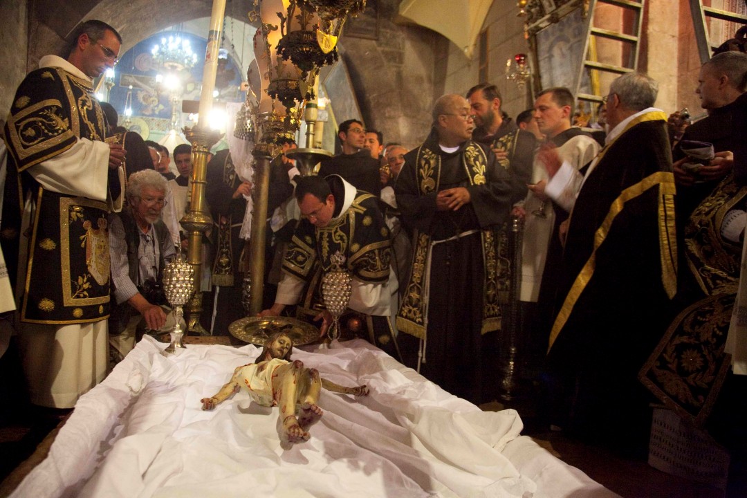 On Good Friday afternoon, the Franciscans of the Custody of the Holy Land conduct a celebration in the Basilica of the Resurrection, known as the Funeral Procession of Christ. This celebration is not as well known as the other Easter celebrations, but it is a very moving and touching ceremony.