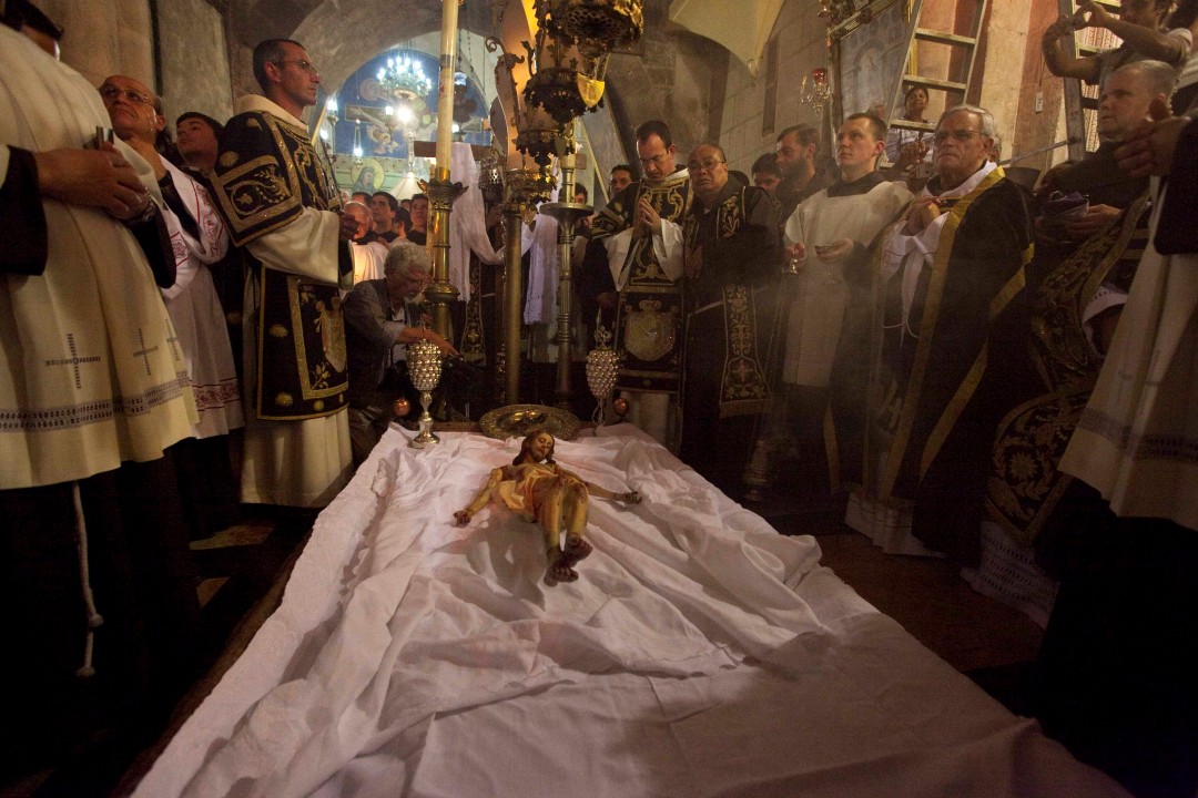 On Good Friday afternoon, the Franciscans of the Custody of the Holy Land conduct a celebration in the Basilica of the Resurrection, known as the Funeral Procession of Christ. This celebration is not as well known as the other Easter celebrations, but it is a very moving and touching ceremony.