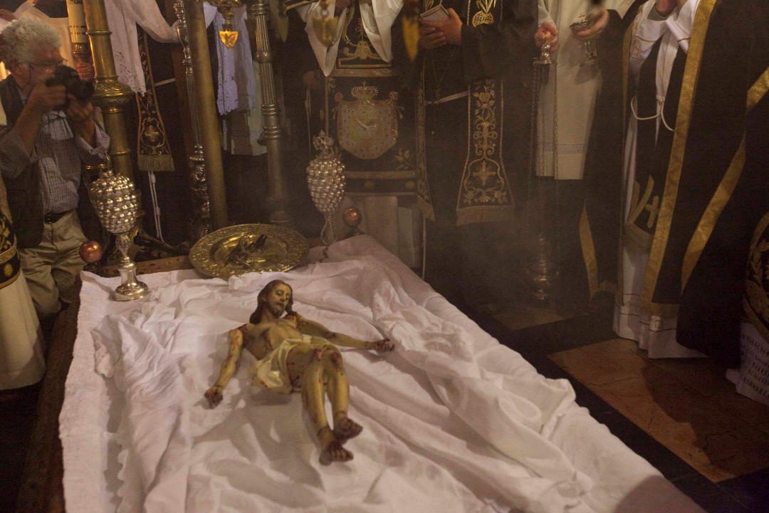 On Good Friday afternoon, the Franciscans of the Custody of the Holy Land conduct a celebration in the Basilica of the Resurrection, known as the Funeral Procession of Christ. This celebration is not as well known as the other Easter celebrations, but it is a very moving and touching ceremony.
