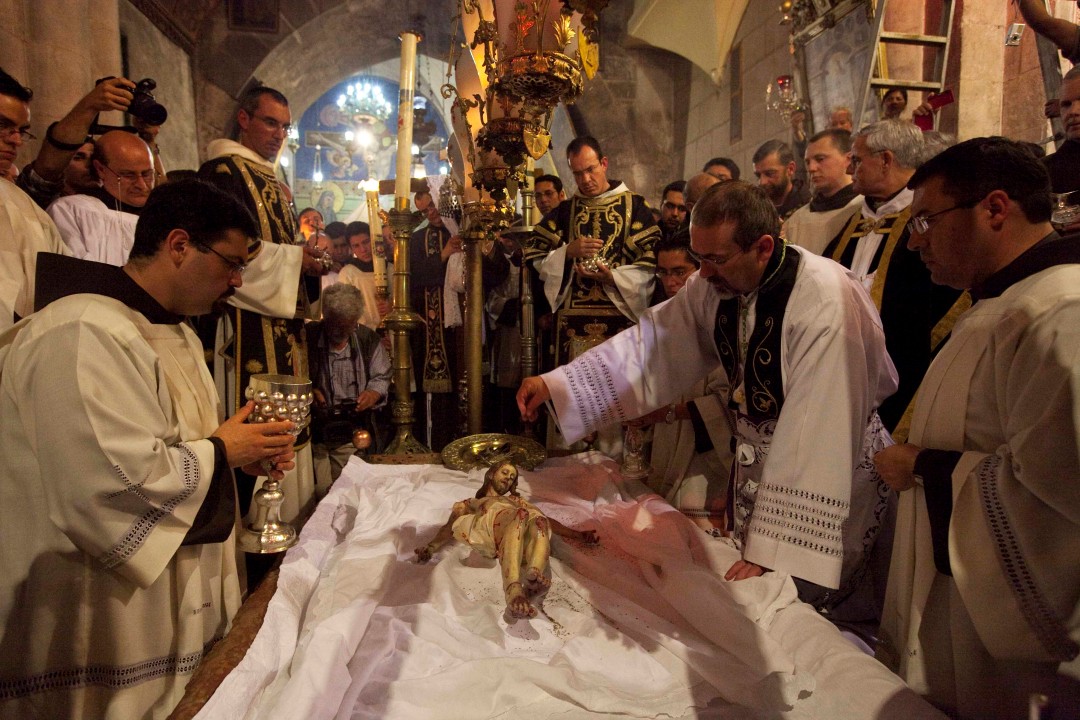 On Good Friday afternoon, the Franciscans of the Custody of the Holy Land conduct a celebration in the Basilica of the Resurrection, known as the Funeral Procession of Christ. This celebration is not as well known as the other Easter celebrations, but it is a very moving and touching ceremony.